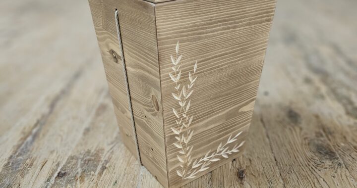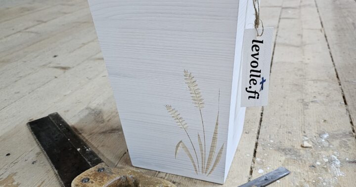 Kotimainen Levolle.fi oksahongasta valmistettu uurna jossa käsinkaiverrettu tähkäkuviointi.