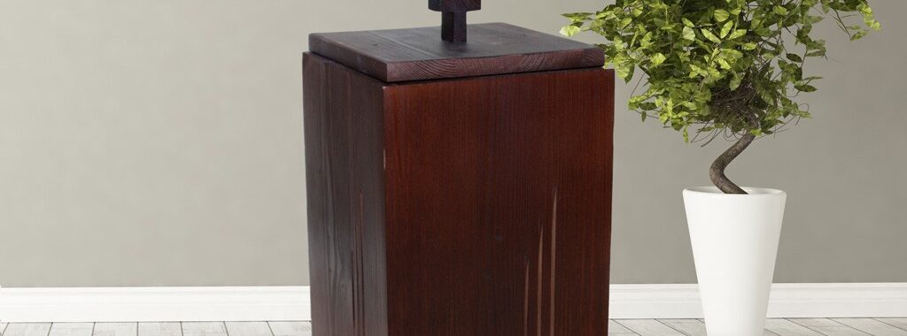 Tummanruskea mäntyuurna, kyljessä kaiverretut kolme viivaa.