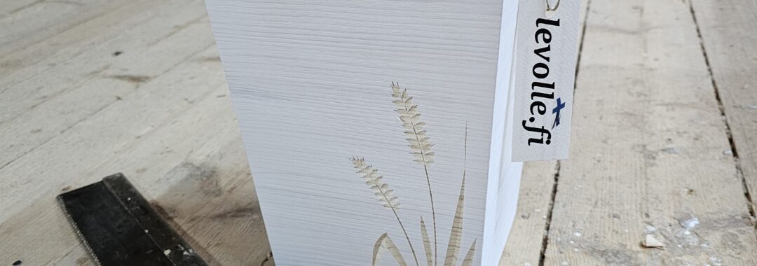 Kotimainen Levolle.fi oksahongasta valmistettu uurna jossa käsinkaiverrettu tähkäkuviointi.